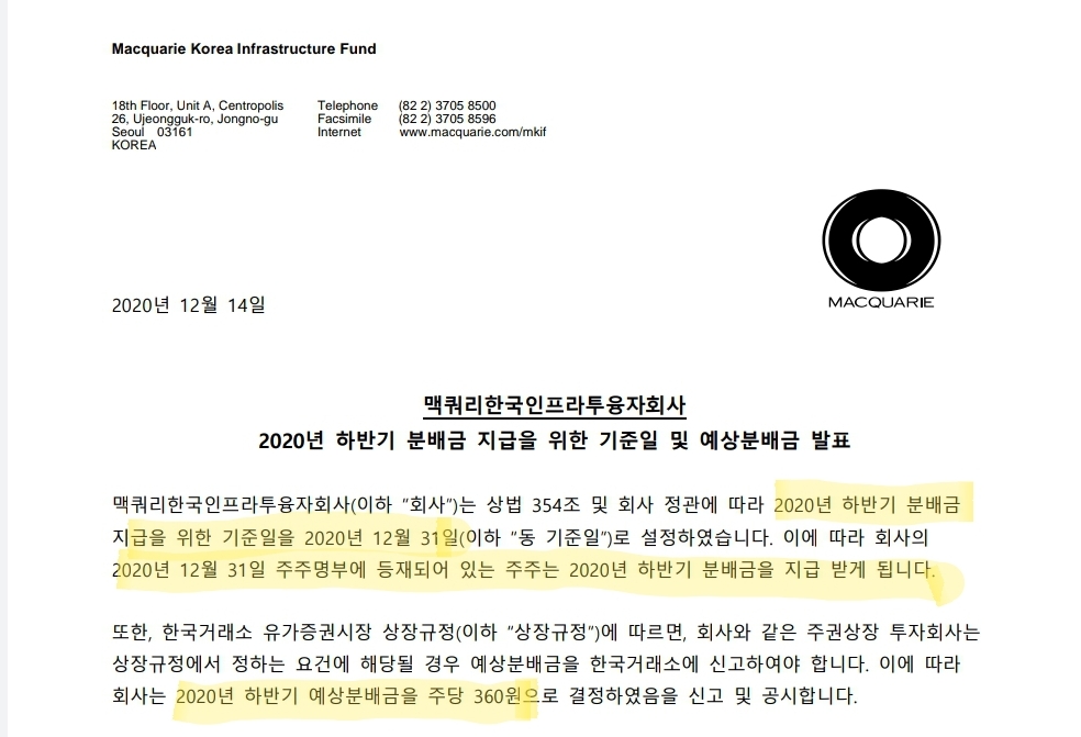 맥쿼리 인프라는 2020년 하반기 분배금을 주당 360원으로 결정하였는데요.
